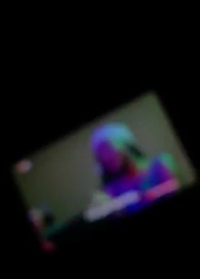 A small smartphone screen displays a video of a man wearing a Santa hat and a red jacket. He appears to be playing a stringed instrument under colorful lighting. The screen is tilted at an angle against a dark background and out of focus.