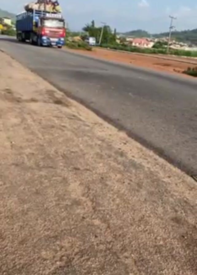 A semi-truck hauling a load of sacks and several people on top passes by on a paved road under a blue sky. The truck is blue, yellow, and red. The sacks are light colored and piled high on the truck's flatbed. Several people are seated on top of the sacks. The road is gray and has a dirt shoulder. In the background, there are houses and trees. The camera is held by someone standing on the side of the road.