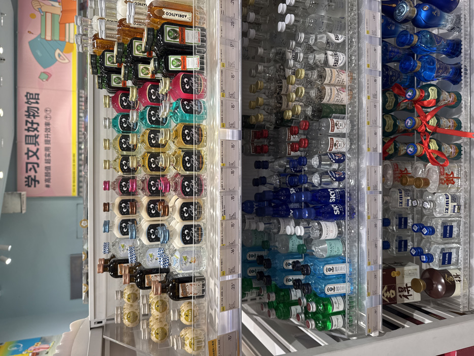 - "A retail shelf displays rows of miniature alcohol bottles" by FM-4DZAk2, licensed under CC BY 4.0