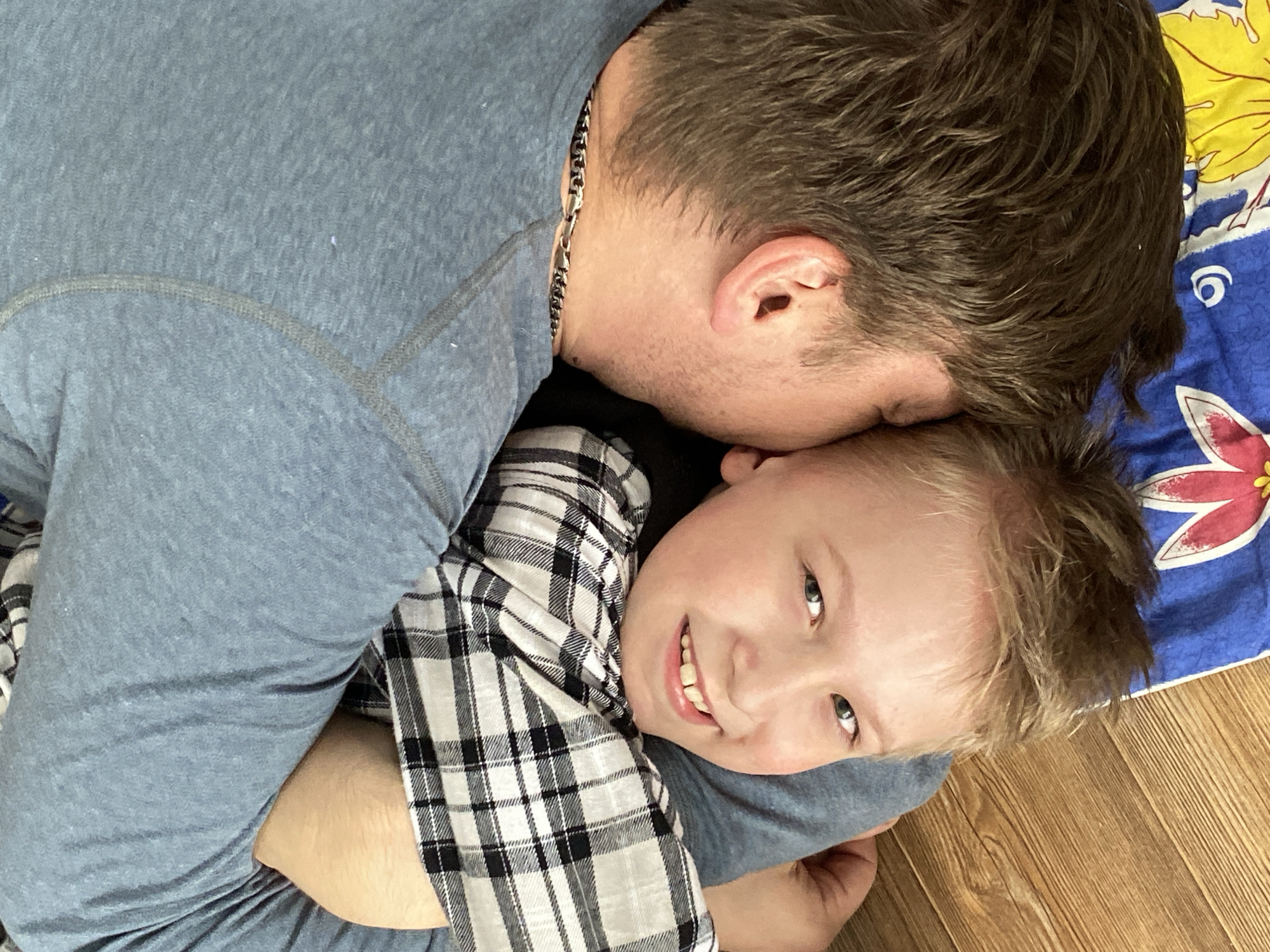 A father and son are lying on the floor. The father, with dark hair and a silver chain around his neck, has his head close to the son's, almost kissing his forehead. The son, a young boy with light hair and a plaid shirt, looks at the camera and smiles. They are lying on a wooden floor next to a blue and yellow floral blanket. The location is Chaikovsky, Russia.