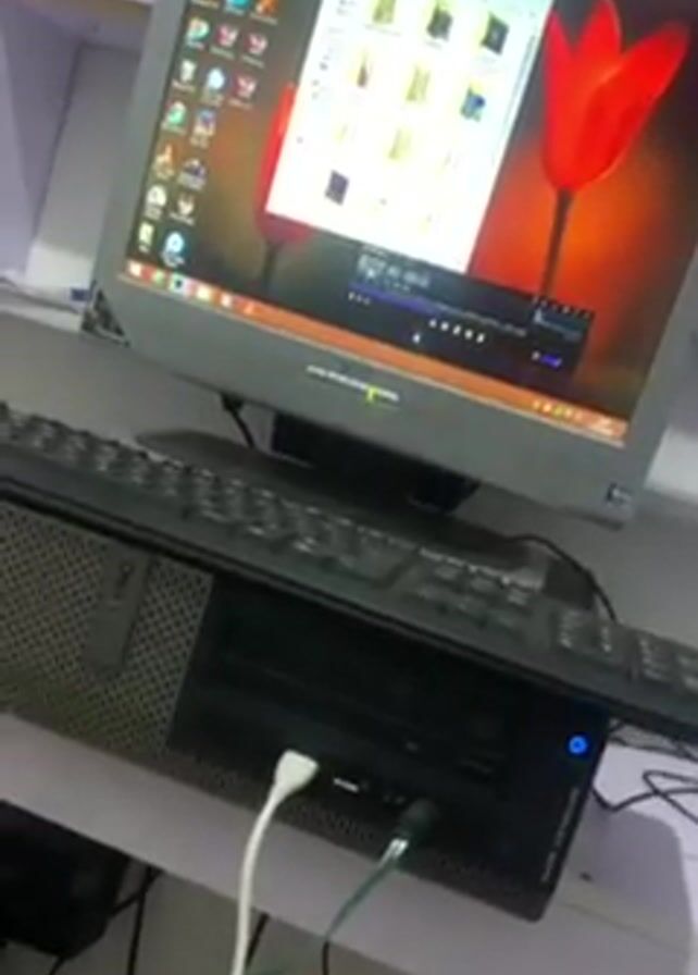 A computer is on a white desk, displaying an open window of files and a media player playing music. The computer is a Dell Optiplex with a black keyboard resting on it. A white USB cable and a green audio cable are plugged into the front of the computer. A black mouse sits to the right of the computer. The monitor shows a wallpaper of a red tulip. Shelves are visible in the background. The camera pans slowly around the computer.