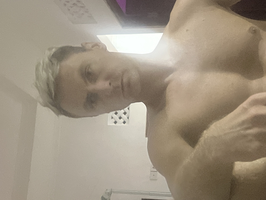 The scene depicts an adult male in a head-on, chest-up self-portrait within an indoor room in Celuk, Indonesia. The male subject has fair skin, short, light-colored hair, and a muscular, bare upper torso. He maintains a direct, neutral gaze towards the camera. The background consists of plain, light-colored walls. On the left, a white electrical wall outlet is visible, partially obscuring a white furniture piece or shelf. A square, white ventilation or decorative block with an interwoven pattern is affixed to the wall behind the subject, slightly right of center. To the subject's right, a doorway or opening reveals brighter light and a faint magenta hue in an adjacent area. The room is uniformly lit.