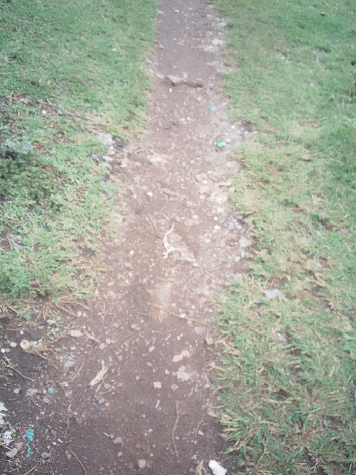 The image displays a narrow, unpaved dirt path, approximately one meter wide, extending vertically through the frame. The path, composed of light brown soil and small embedded stones, is bordered on both sides by green grass. Scattered debris, including small fragments of green and white plastic, is visible on the path and within the adjacent grass. Centrally located on the path are skeletal remains, consistent with a small animal. No individuals or active interactions are present. The environment is outdoor, characterized by natural ground cover. This scene is located in Juja ward, Kenya.
