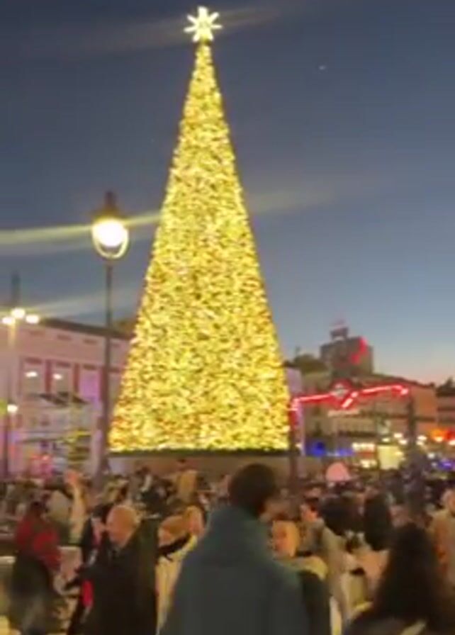 nighttime view of a public square crowded with people. In the foreground, many pedestrians are walking. The main focal point is a large, brightly lit Christmas tree with a star on top. Streetlights illuminate the scene. In the background, buildings are visible, some adorned with colorful lights and advertisements. The sky is a deep blue, suggesting twilight or early evening. The overall atmosphere suggests a festive holiday season in an urban environment.