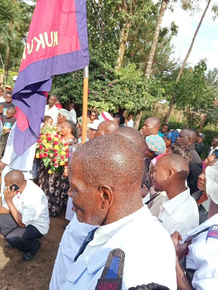An outdoor gathering is depicted in Lumakanda ward, Kenya, under bright daylight conditions. In the immediate foreground, a bald, dark-skinned man wearing a light blue collared shirt and a dark tie is shown in profile, facing left. A black and blue shoulder strap with white text is visible on his right shoulder. To his left, a man in a white short-sleeved shirt and dark trousers is squatting on unpaved earth, holding a black smartphone to his right ear, engaged in a conversation. A large, two-toned flag, predominantly red with a purple stripe and yellow text spelling "TUKUN," is prominently displayed on a wooden pole in the upper left quadrant. A diverse crowd of people, primarily adults, occupies the midground and background. One woman in the midground holds a large bouquet composed of red, yellow, and orange flowers. The background is characterized by numerous green trees and dense foliage under a bright sky.