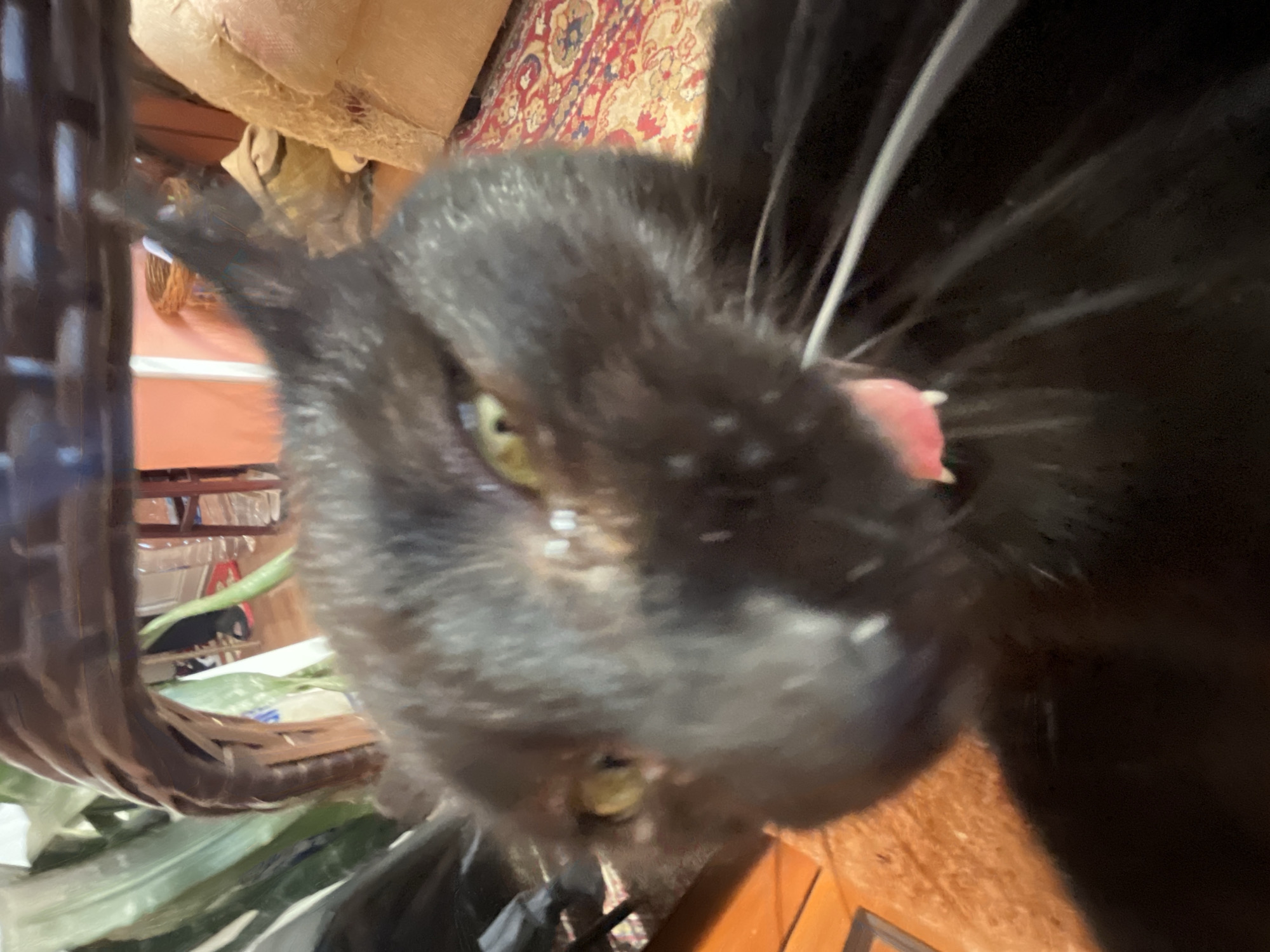 A close-up, slightly blurred image features a black cat with green eyes. The cat is positioned close to the camera, with its nose and whiskers prominent. A pink nose is visible near the mouth. A wicker chair or basket filled with green leafy material is visible in the background on the left side. The background also shows wooden furniture and a rug with a red and beige pattern. The image does not provide any location information.