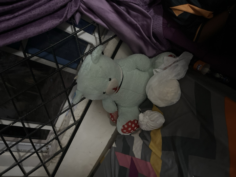 A light blue teddy bear is prominently displayed, seated upright, on a patterned textile surface. It features red polka-dotted fabric accents on its right arm and left leg, a white muzzle, dark eyes, and a red mouth line. A black and white striped detail is around its neck. Two translucent plastic bags rest on the surface in front of the bear; one is tightly tied, containing a light-colored, amorphous material, while the second, slightly larger bag is partially open, revealing similar contents. The underlying textile surface features a geometric pattern in shades of grey, pink, light blue, and yellow. To the right, a dark purple curtain hangs, partially obscuring a background element. A black metal security grille with a diagonal lattice pattern is visible in the upper background, positioned in front of a light-colored wall and a dark, indistinct exterior, indicative of low light conditions. In the lower right corner, an orange-labeled bottle, resembling a Fanta product, lies horizontally, partially obscured, alongside a smaller clear plastic bottle. The specific location within Lokoja, Nigeria, cannot be determined from the visual information provided.