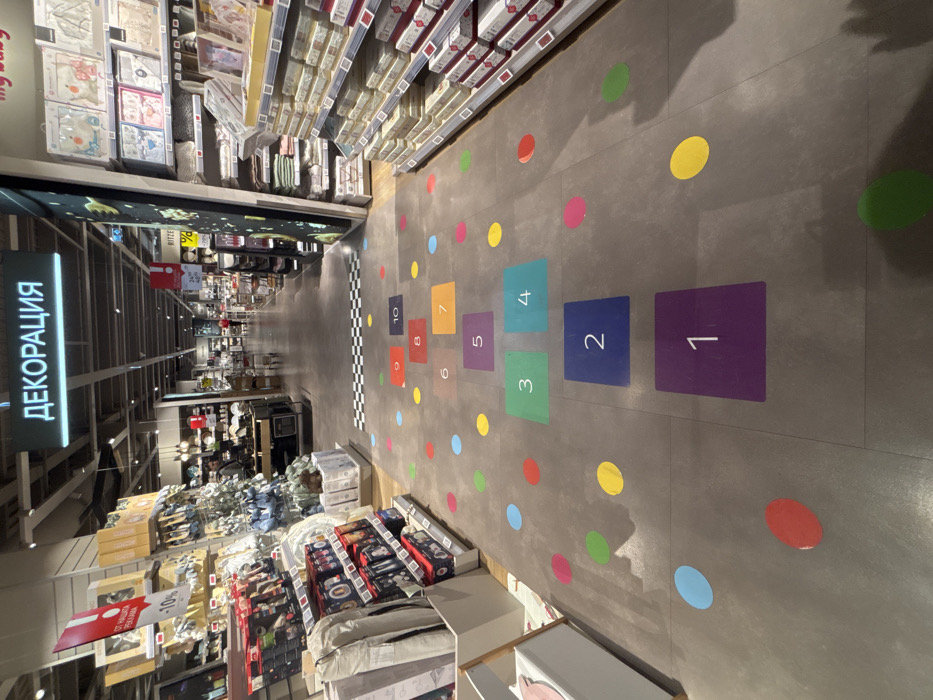 This image depicts the interior of a large retail store, likely an Aiko or Mobbo branch, located in Sofia, Bulgaria. The perspective is from a low angle, looking down a wide aisle. The floor is a light grey tile, serving as the base for a prominent, multi-colored hopscotch game. This game consists of numbered squares from 1 to 10 in various colors (purple for 1, blue for 2, green for 3 and 4, orange for 5, red for 6 and 7, yellow for 8, red for 9, blue for 10) and numerous scattered colored circular decals (red, yellow, green, blue, purple, orange). A black and white checkered pattern marks a point further down the aisle where the hopscotch path seemingly ends. Overhead, a prominent teal sign with white Cyrillic text reads "ДЕКОРАЦИЯ" (DEKORATSIYA), indicating a "Decoration" section of the store. The ceiling features exposed utility pipes and track lighting fixtures, providing general illumination. On the left side of the aisle, white shelving units display a variety of home goods, including packaged textiles, kitchenware, and decorative items. A red vertical sign with "-10%" is visible on one display. Further down, more complex product arrangements are present, suggesting diverse merchandise. On the right side of the aisle, white shelving units display neatly stacked merchandise, predominantly packaged baby items and children's products, identified by a partially visible "my baby" sign and a yellow sign featuring "RITZI." Two indistinct figures are visible further down the aisle: one to the left, partially obscured by shelving, and another in the center-right, appearing to walk away from the camera. No specific actions or interactions are clearly discernible. The overall environment is well-lit and organized, typical of a modern hypermarket or large department store.
