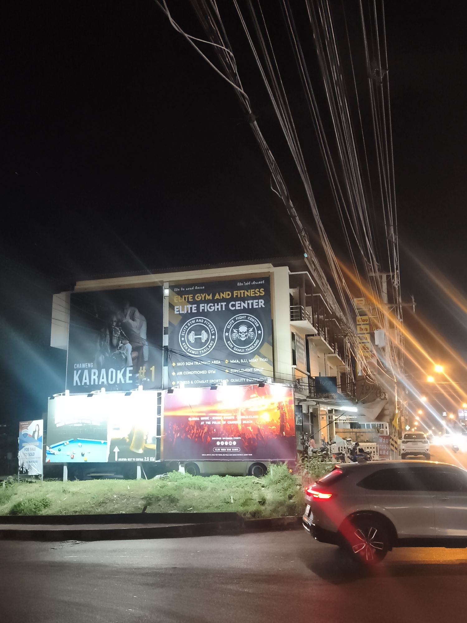 The image depicts a street scene in Baan Bo Phut, Thailand, at night. A multi-level building is visible, adorned with large billboards advertising "Elite Gym and Fitness" and "Chaweng Karaoke #1." One billboard features an image of a pool table and advertises a location 2.5 KM to the central district. Utility wires crisscross overhead. A light-colored car is in motion on the street in the foreground. Other vehicles are visible in the background, along with streetlights and signs in Thai. The roadside is lined with greenery.