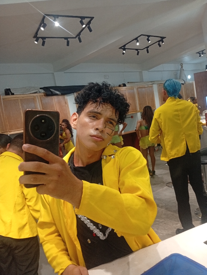 A young man with curly hair and facial markings poses for a selfie, holding a smartphone. He wears a black shirt with a silver and red ornament, overlaid by a bright yellow jacket. The background is a room filled with people also in yellow outfits, including a man with blue hair. Cabinets line the back wall, and modern black track lighting is visible on the ceiling. The scene appears to be a behind-the-scenes moment, possibly during a performance or event.