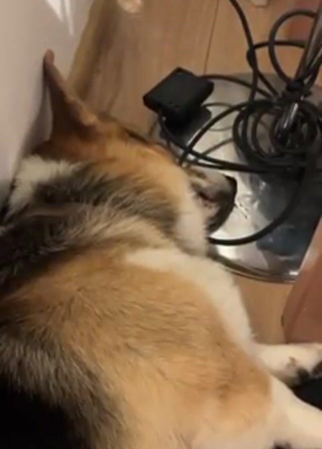A sleeping corgi rests on its side on a wood floor. The dog's head is pressed against a white wall. The fur is a mix of white, tan, black, and brown. A black cord and a small black device are coiled on a small metal table near the corgi.