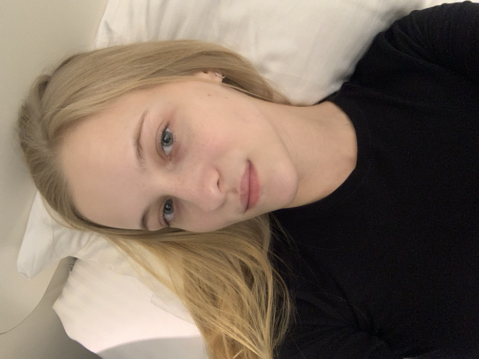 A young female is depicted in a close-up, top-down shot, lying on her back on a white pillow, looking directly at the camera. She has long, light blonde hair, fair skin with visible freckles across her nose and upper cheeks, and light blue eyes. A small, silver-toned hoop earring is present in her right earlobe. She is wearing a plain black, round-neck garment. The background consists solely of white bedding and what appears to be a white headboard, indicating an indoor setting. The image does not contain visual information to determine the specific city location as Odesa, Ukraine.