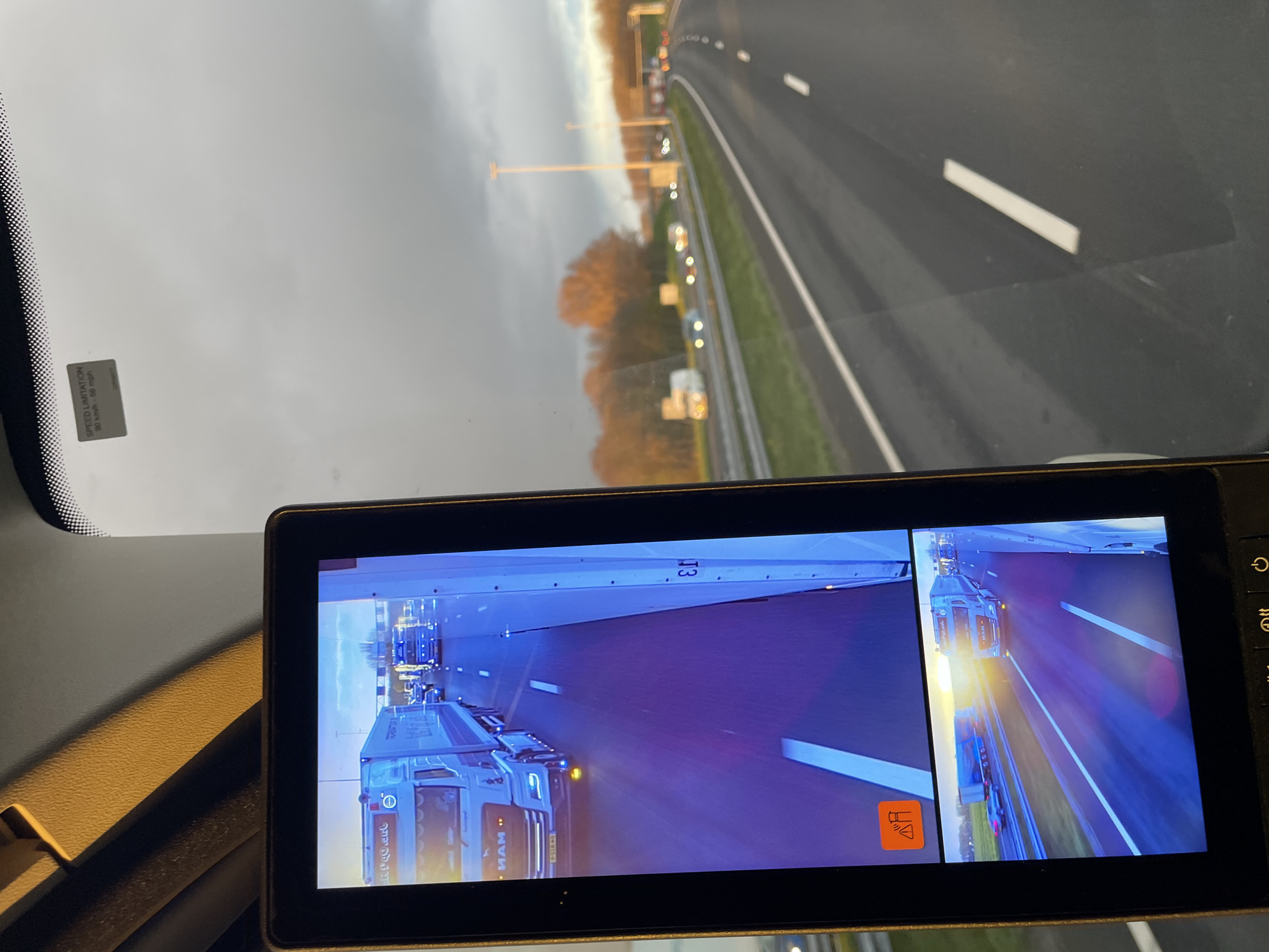 The image provides a forensic view from the interior of a commercial vehicle, likely a truck, facing forward on a multi-lane highway in Vianen, Netherlands. In the immediate foreground on the left, a black rectangular electronic display unit is positioned vertically. This unit presents two distinct camera views: 1. **Upper screen:** Displays a live feed from a side-mounted camera, showing the vehicle's right-hand side. A light-blue MAN semi-truck with a white trailer, bearing Dutch license plate "B-SIB-40", is visible in the adjacent lane, traveling parallel to the observer's vehicle. The road surface is dark asphalt with white dashed lane markings. An orange warning icon, depicting a vehicle with a triangular caution symbol, is present in the lower-left corner of this screen. 2. **Lower screen:** Presents a wider-angle view, likely from a different side or rear-facing camera, depicting the same MAN semi-truck and another blue semi-truck further ahead. A blue passenger car is also visible on the far left lane. The sun is low on the horizon, creating a prominent lens flare and illuminating the scene from the right. The remaining portion of the image, visible through the vehicle's windshield, shows the external highway environment. The multi-lane highway curves gently to the right, marked by white dashed lines on the dark asphalt. Numerous vehicles are present on the highway in the distance, displaying illuminated headlights and taillights. On the left side of the highway, a dense line of trees with autumn foliage (orange/brown) runs parallel to the road. Tall, silver streetlights and overhead highway gantries are visible above the road. The sky above is overcast grey, with a brighter, golden light band along the horizon, indicative of either sunrise or sunset. Affixed to the upper-right portion of the windshield is a white rectangular sticker reading "SPEED LIMITATION 80 km/h - 50 mph" and a code "CE5302".