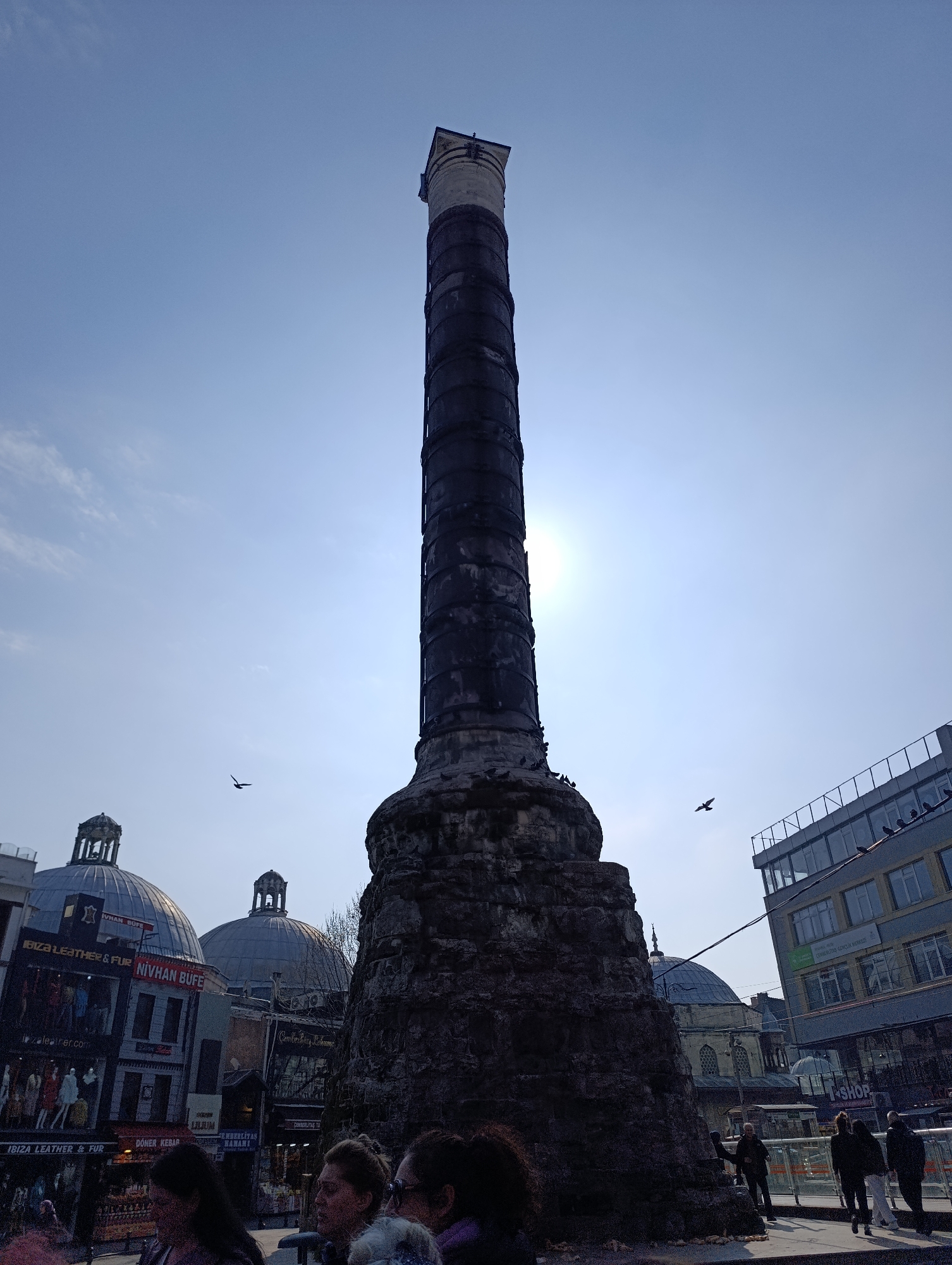 The image showcases the Column of Constantine in Istanbul, Turkey. The ancient column is a tall, dark, cylindrical structure with a weathered, textured surface. It stands on a large, rough base, appearing almost like a natural rock formation. The top of the column is lighter in color and has a more defined architectural shape. The sky behind the column is bright with the sun partially obscured, creating a halo effect. In the foreground, there are blurred figures of people, suggesting a street-level view of the monument amidst pedestrian activity. Various buildings surround the column, including structures with domed roofs, reminiscent of historical architecture, and more modern buildings with flat roofs and visible windows. The presence of street-level shops with signage like "IBIZA LEATHER & FUR" and "DONER KEBAB" indicates a commercial area with shops and eateries. The photo captures the blend of historical significance and modern urban life that is characteristic of Istanbul. Two birds are seen flying against the backdrop of the sky.