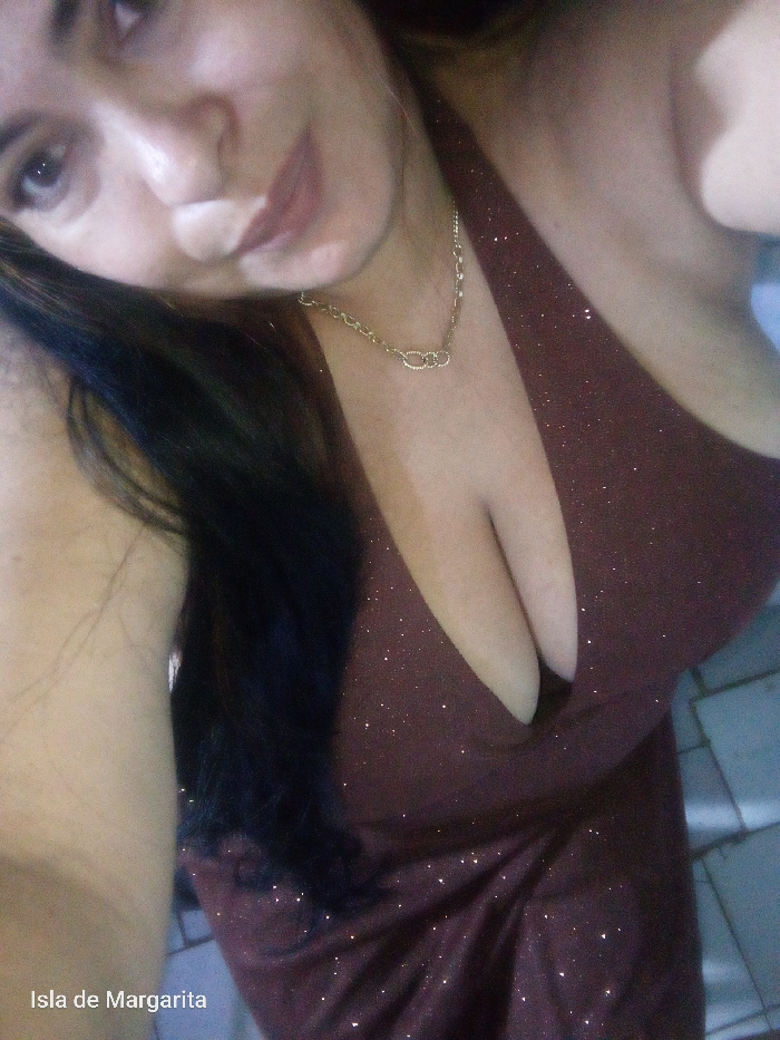 A single female individual is depicted in a close-up, high-angle self-portrait. Her upper torso and a portion of her face are visible, specifically her right eye, nose, and a slight smile. She has dark hair cascading over her left shoulder and chest. She is wearing a dark, possibly maroon or reddish-brown, shimmering, low-cut, halter-neck style garment that exposes significant cleavage. A thin, gold-colored necklace, featuring a triple-interlocking-loop design, rests on her décolletage. The background is blurred, revealing what appears to be light-colored tiled flooring or a wall in the lower right, indicative of an indoor setting. The image contains a text overlay "Isla de Margarita" in the lower left corner. Juan Griego is a city located on Isla de Margarita, Venezuela; however, the precise location within Juan Griego is not discernible from the visual information provided.