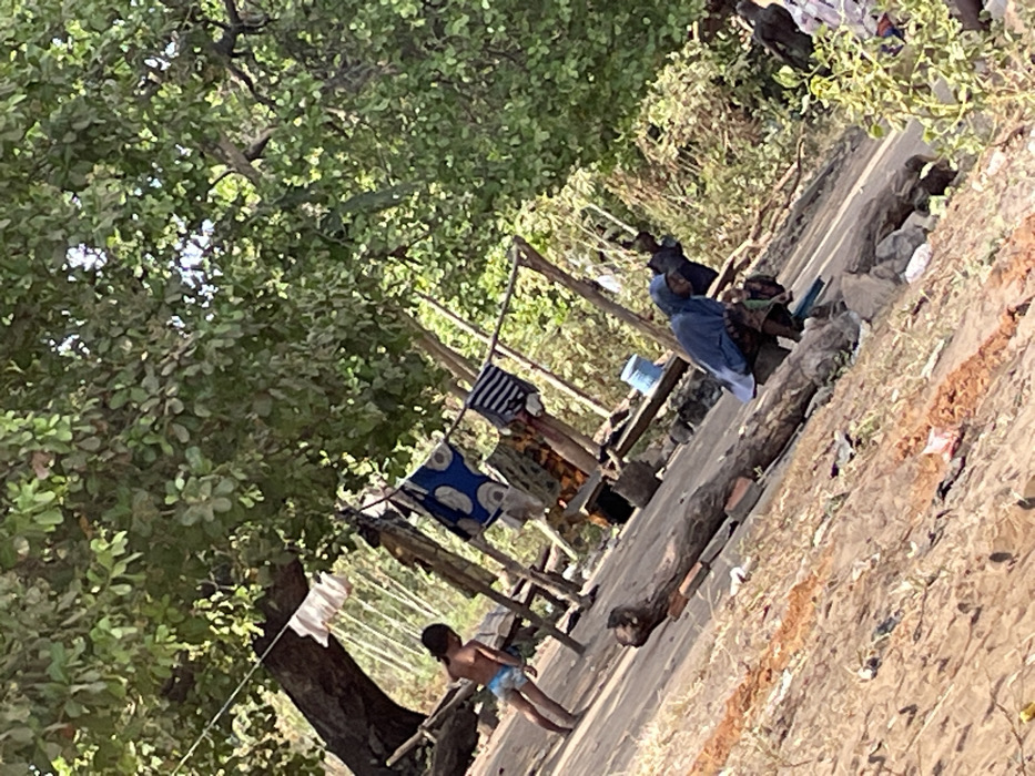 This image depicts an outdoor scene in the city of Osara, Nigeria, under direct daylight. The foreground consists of dry, reddish-brown earth and sandy patches, containing scattered debris and small fragments resembling broken brick. A long, dark-colored timber log lies horizontally across the mid-ground. To the left, a young child, bare-chested and wearing light blue disposable-style underwear, stands with their back partially to the viewer, facing towards the right side of the frame. Centrally, an improvised clothesline, strung between two wooden posts, displays various garments, including a blue and white patterned cloth and a striped fabric. Behind this clothesline, rudimentary wooden structures and planks are visible. The upper and background portions of the image are filled with dense green foliage from large deciduous trees, suggesting a verdant environment. To the right, an adult figure, clad in a light blue hooded garment that covers their head and upper body, is seated on a low, indistinct object, partially obscured by the foreground log. A light blue plastic bucket is visible near the seated individual. Another person or a portion of a person in dark attire is partially visible behind the seated figure. The overall impression is an informal dwelling or communal area.