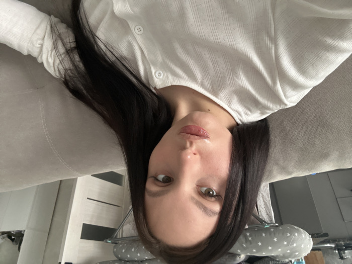 The scene is located indoors in Noviy, Russia. A single female subject, appearing to be a young adult, is depicted from the chest up, positioned to face the camera directly. She has long, dark, straight hair parted down the middle, fair skin, and brown eyes. Her lips are visibly glossy and formed into a puckered expression. She is wearing a light-colored, possibly white or off-white, long-sleeved top or cardigan with a ribbed texture and small white buttons down the front. She is seated or reclining on a light grey fabric sofa with visible stitching detail. In the background, to the left, a grey nursing or baby pillow with white star patterns is resting on a surface, possibly a kitchen counter or shelf. Further back, light-colored cabinetry or a door featuring horizontal dark lines is visible. The lighting is bright and even.