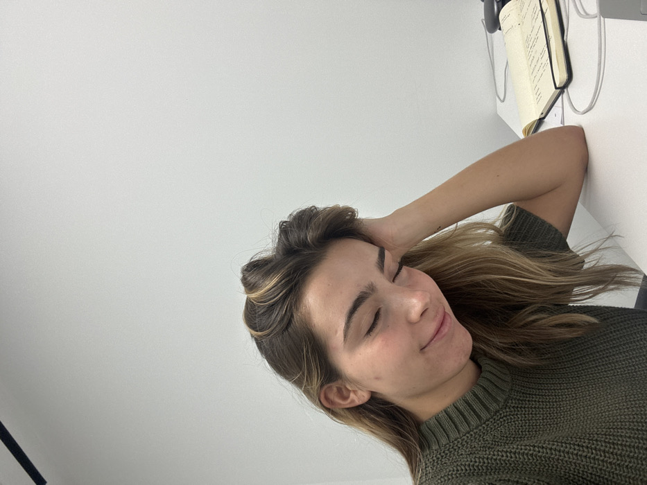 An interior room within an unidentified building in the city of Unknown, Unknown. The scene depicts a single female individual with medium-long, light brown hair with blonde highlights, wearing a short-sleeved, olive-green ribbed sweater. Her eyes are closed, and a subtle smile is present on her face. Her left hand supports her head, with her elbow resting on a white desk surface. On the desk to her right, an open black notebook containing handwritten text is visible, positioned next to white cables and a partially obscured black electronic device. The background consists of a plain white wall, uniformly illuminated.