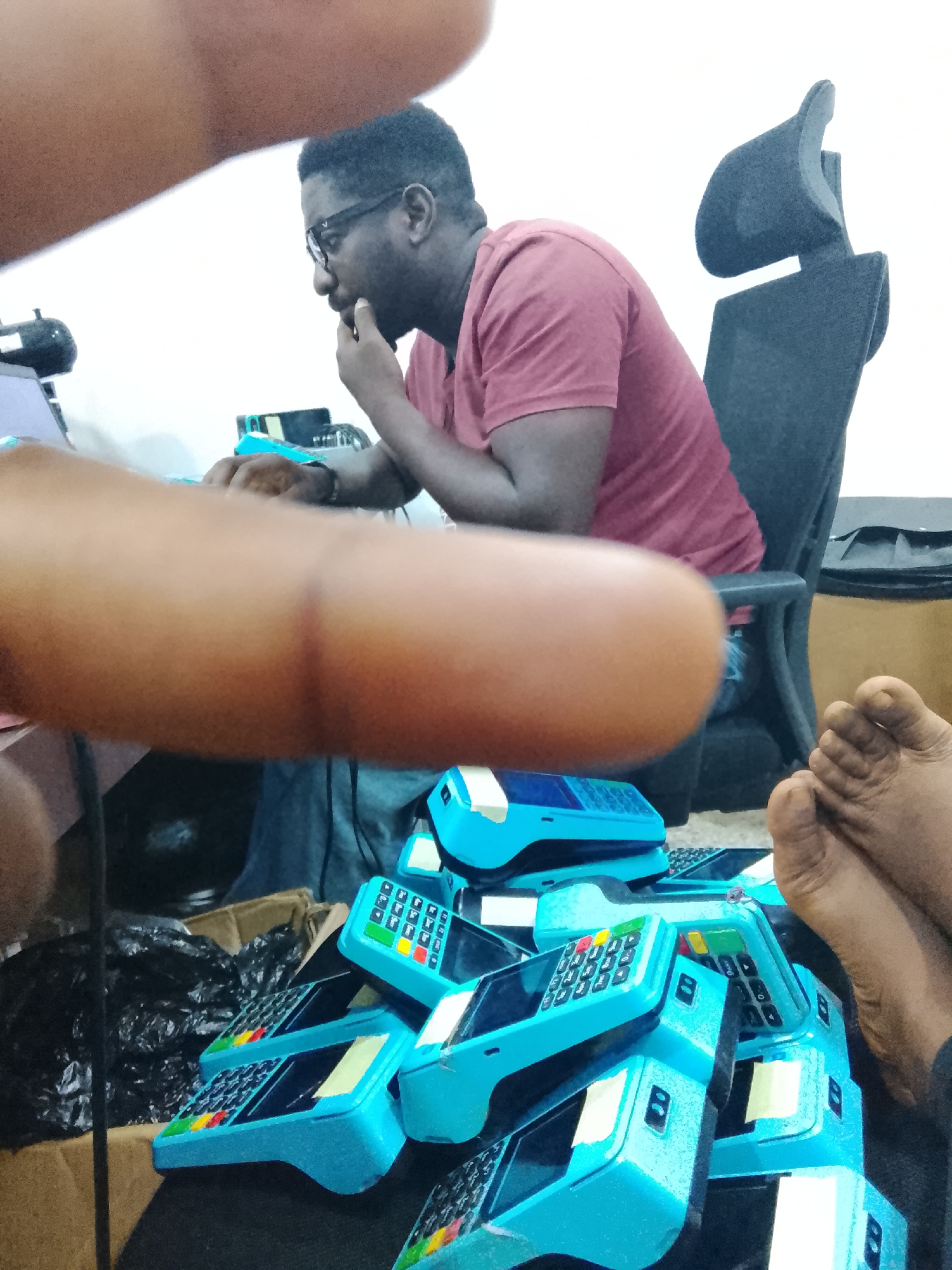 The scene depicts an indoor setting, likely a workspace, in an unspecified city and location. A dark-skinned male with a beard and glasses, wearing a reddish-brown short-sleeved shirt and blue jeans, is seated in a dark grey ergonomic office chair. He is positioned facing left, looking intently off-camera, with his right hand resting on his chin. A laptop is partially visible on a dark desk surface to his left. In the foreground, a dark-skinned forearm extends across the upper-center, and a pair of bare, dark-skinned feet are visible and crossed in the lower-right quadrant. A large quantity of light blue electronic devices, consistent with point-of-sale (POS) terminals featuring keypads and screens, are stacked in the lower and mid-right areas of the image. Several devices have yellow labels affixed to their screens. A crumpled black plastic bag is visible within a cardboard box behind the stacked terminals. The background consists of a plain white wall.
