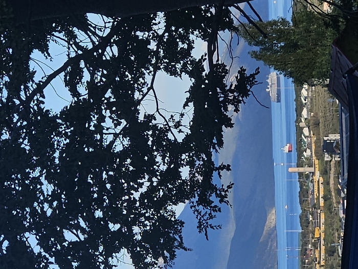 A coastal town is partially obscured by a tree silhouette. A large cruise ship sits on a body of water with hills in the background. Smaller buildings and vegetation line the coast. The sky is partially visible through the tree branches, hinting at clear weather.