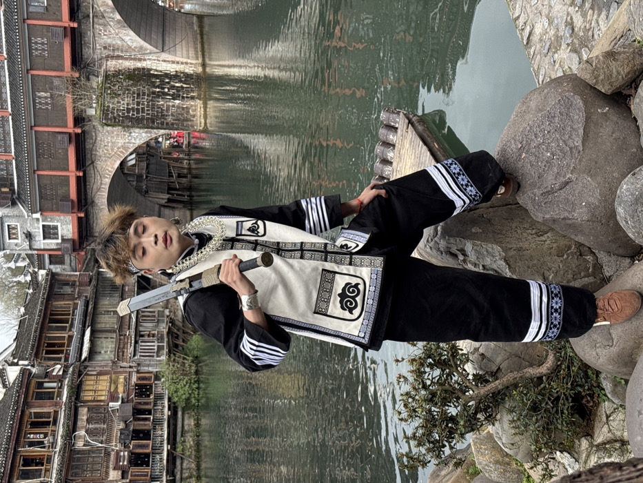 - "A male individual is depicted posing on a rocky riverbank in Fenghuang Ancient Town, Hunan Province, China, along the Tuojiang River" by FM-7eaFY2, licensed under CC BY 4.0