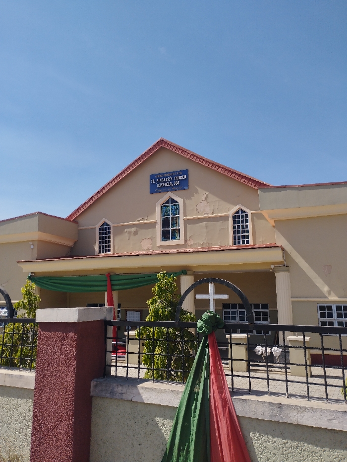 The image displays the exterior of St. Finbarr's Church, located in Gura Top, Nigeria. A sign on the church's facade identifies it further as "ST. FINBARR'S CHURCH BAYFIELD, JOS." The building presents light tan-colored walls with areas of peeling paint or stucco, topped by a gabled roof section covered in reddish-brown tiles. Several windows with white grilles are visible across the facade. Green and red fabric drapes are suspended horizontally across the front entrance area, which features supporting columns. In the foreground, a low wall composed of textured maroon and lighter beige sections supports a black metal fence. The fence incorporates a decorative black metal arch containing a white cross, from which green and red fabric streamers are draped downwards. Small green coniferous bushes are visible behind the fence. The scene is illuminated by bright sunlight under a clear, cloudless blue sky. No individuals are present, and no specific actions or interactions are depicted.