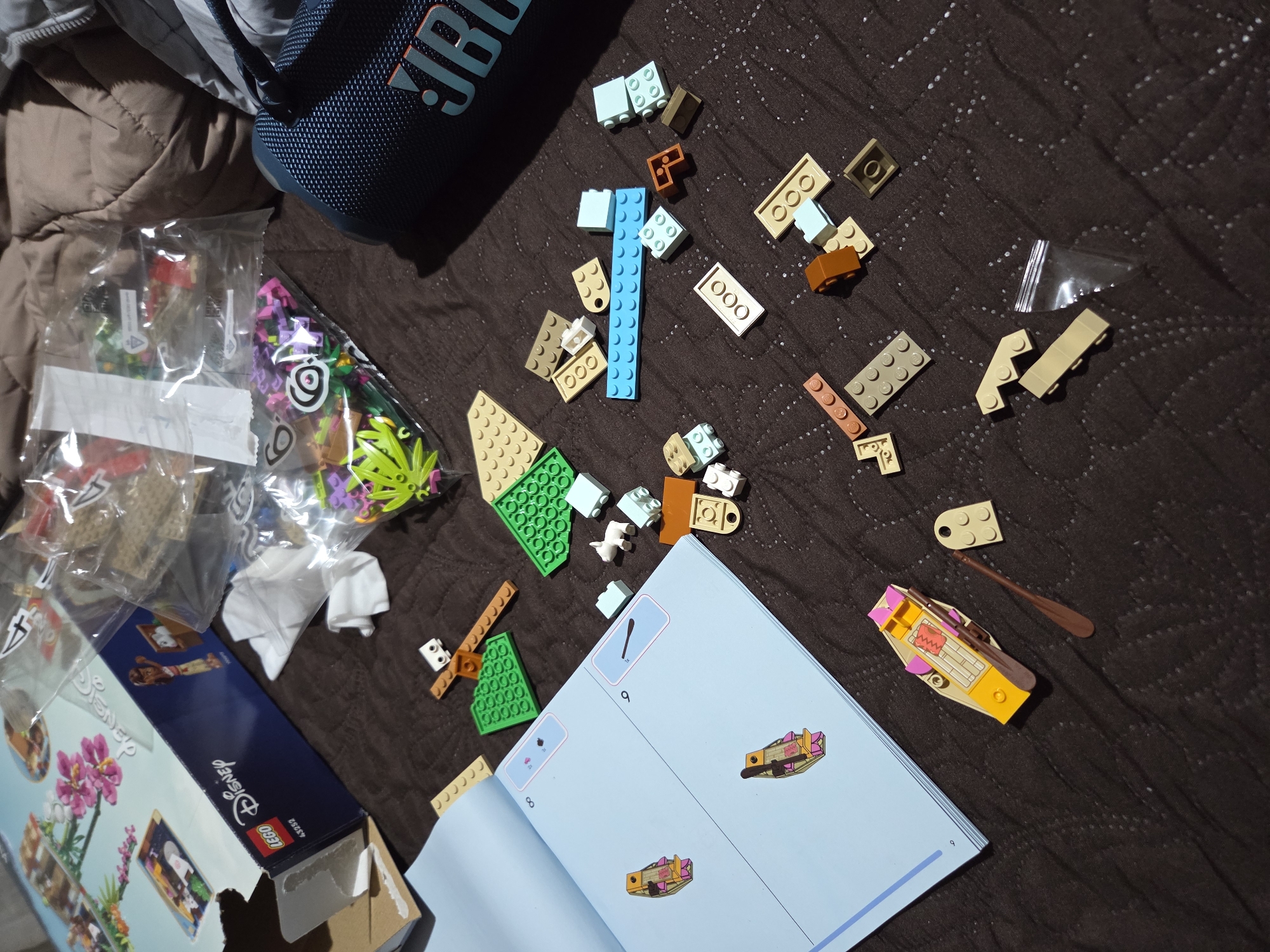 The scene depicts a partially completed LEGO Disney set (43252) scattered on a brown, textured surface (likely a bedspread or blanket). The opened box for the set is in the lower-left corner. Various LEGO bricks are spread around the instructions, which are open to steps 8 and 9, featuring an image of the boat being constructed. A blue JBL speaker and opened plastic bags containing more LEGO pieces are visible in the upper-left quadrant. A small, assembled LEGO boat with an oar is on the right, near the open instruction manual.