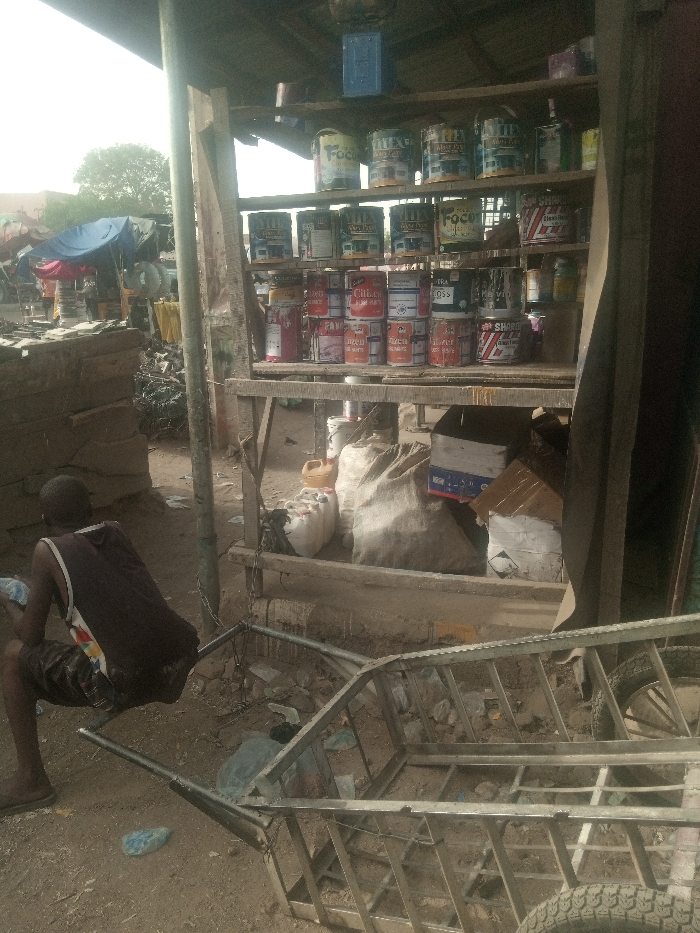 This image depicts an outdoor market stall in Kofar Ruwa, Nigeria. The scene is illuminated by daylight, with a bright sky visible in the upper left. A central wooden-framed stall features multiple shelves stocked with numerous cans of paint in various colors and brands, including "Foco," "Citizen," "Sharom," "Makollex," "Boss," and "Glensilk." Below the shelves, on the dirt ground, are several large fabric sacks, multiple white plastic jerrycans, one yellow jerrycan, and cardboard boxes. One cardboard box shows blue and white markings; another features a black-bordered hazard diamond symbol. A blue container is suspended from the stall's roof structure. To the left, a dark-skinned male individual is positioned with his back to the camera, appearing to squat or sit on a low, indistinct object. He wears a dark sleeveless top with a patterned lower back section and dark, possibly patterned, shorts. He holds a small, light-colored object in his hands, seemingly engaged with it. In the lower-center and right foreground, an empty, silver-colored metal-framed handcart or pushcart rests on its side, revealing its internal structure and one wheel on the right. The ground throughout the foreground and midground is dirt, scattered with debris including small rocks and light blue plastic elements. In the background, to the left, informal structures are visible, including a structure partially covered by a bright blue tarp, and distant trees under the bright sky.