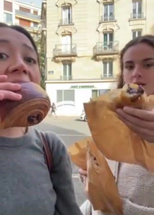 Two young women are walking outdoors, eating baked goods while recording a video. One woman holds and eats a pain au chocolat, pulling it apart to show the interior. The other woman holds and eats a sandwich in a brown paper bag. They are on a city street with buildings in the background, including one with a BNP Paribas sign. People are walking on the sidewalk and a car is parked on the street.