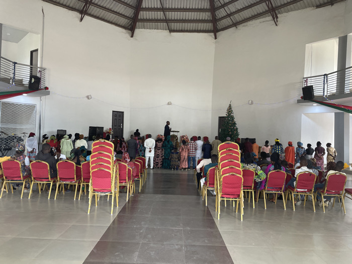 The image depicts an indoor gathering inside a spacious event hall or auditorium located in Jos, Nigeria