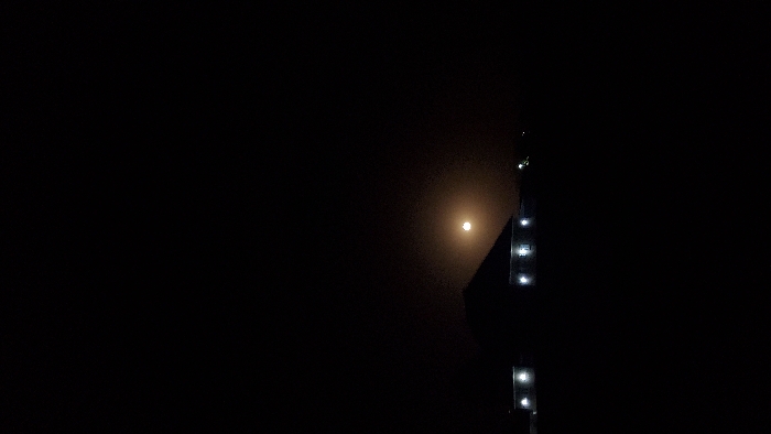 A nearly black photograph features a full moon partially obscured by a hazy cloud cover. To the right, a dark, angular structure rises into the night, accented with a series of evenly spaced, bright, square lights. The illumination from the moon casts a faint glow on the scene, but the dominant impression is one of darkness and a distant, mysterious presence.