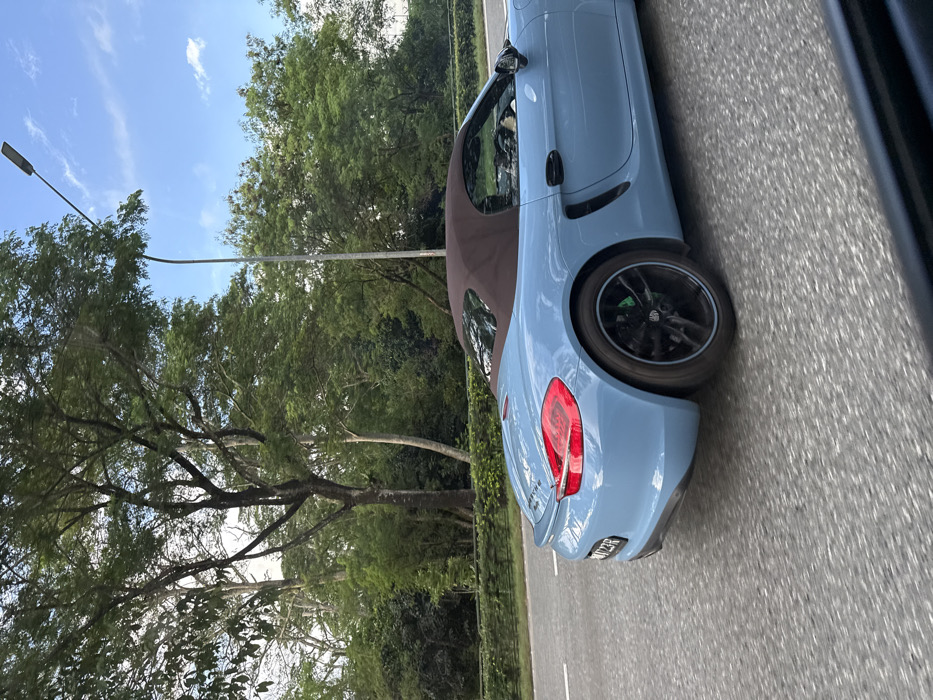 A light blue Porsche Boxster convertible with a dark brown fabric soft top closed is depicted in motion on a grey asphalt road. The vehicle, observed from its rear-right quarter, displays a Singaporean license plate "SGY 123R". It features black multi-spoke alloy wheels with a subtle light blue rim accent and green brake calipers. A person is visible in the driver's seat. The road surface to the left and beneath the car shows motion blur. To the right of the road, dense green tropical foliage, including tall trees and a low hedge, forms the roadside environment. A tall, slender streetlight with an LED fixture extends into a bright blue sky with scattered white clouds. The image captures a vehicle traveling on a road in Singapore.
