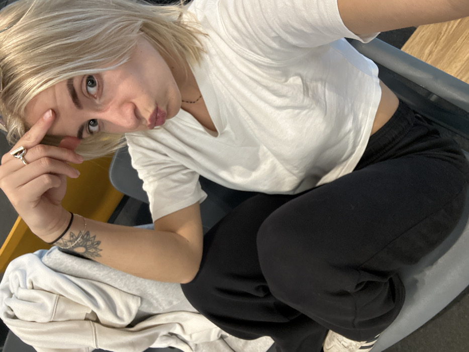 A young adult female with short, light blonde hair is depicted in a close-up, angled shot, appearing to be a selfie