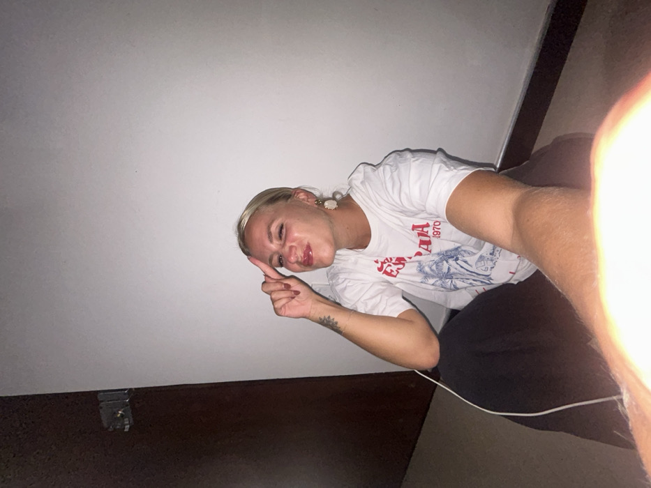 An individual is depicted sitting on a light-colored floor against a plain, light-colored wall in Ahangama, Sri Lanka. The subject is a female with blonde hair, wearing a white short-sleeved t-shirt with a graphic design featuring "BAJA 1970" and palm trees, and dark trousers. She has gold-colored hoop earrings with white pendants and a tattoo on her left upper arm. Her left arm is bent, with her left index finger extended and touching her left temple in a gesture. Her eyes are squinted, and her mouth is slightly open with pursed lips. A white cable is visible near her left leg. To the far left, a dark-colored door frame is partially visible. The scene is illuminated by artificial light, and a prominent lens flare obscures the lower right portion of the image, including the subject's right arm.