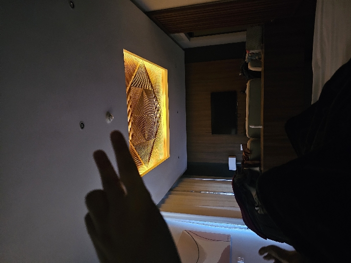 A dimly lit room showcases a modern artwork, seemingly crafted from layered wood and illuminated from within, mounted on a white wall. A hand extends towards the artwork, fingers forming a peace sign. A glimpse of the interior reveals a television, furniture, and wooden flooring, hinting at a cozy living space. A blurred dark shape partially obscures the view.
