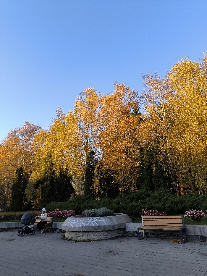 This image depicts a public outdoor area, likely a park or promenade, in Rivne, Ukraine, under a clear blue sky. The scene is dominated by a line of trees with vibrant golden-yellow autumn foliage, suggesting the season. Below these trees are dense, dark green shrubs and smaller evergreen trees. In the foreground, a gray paved area covers the ground. To the left, a single individual, wearing a light-colored beanie and jacket, is seated on a light-brown slatted bench with dark metal supports. Immediately to their left, a dark-colored baby stroller with prominent wheels is positioned on the pavement. To the right of the seated individual and stroller, a large, multi-level concrete planter with a grey, rough texture contains a small, light-colored plant. White graffiti is visible on the upper, broader section of this planter. Further to the right, another identical light-brown slatted bench with dark metal supports is unoccupied. Scattered brown and yellow leaves are visible on the paved ground, particularly near the benches and planter. Pink flowers are blooming in patches within the shrubbery behind the planter. The light source appears to be from the left, illuminating the golden leaves brightly while casting parts of the foreground into shadow.