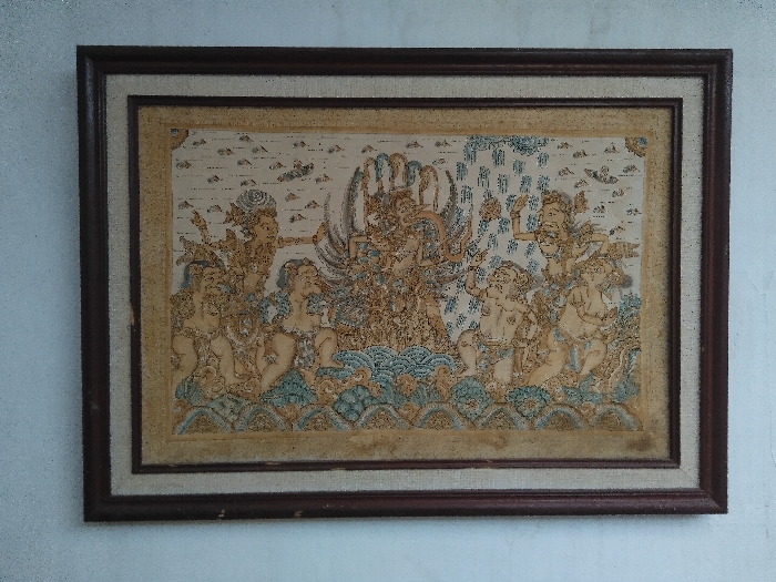 This image displays a framed artwork, located in Phouviang-Gnai, Laos, hanging on a plain, light-colored, textured wall