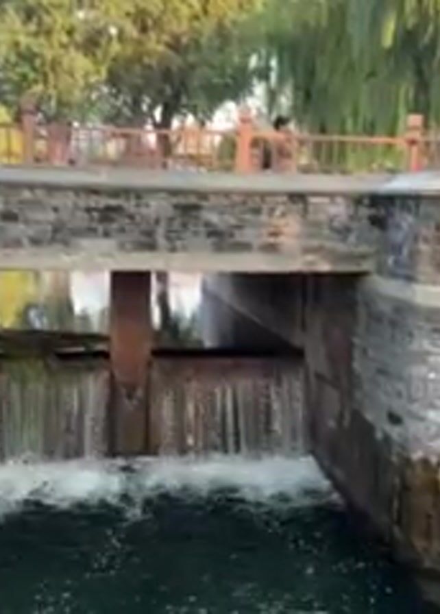 A stationary, eye-level shot displays a small, man-made waterfall flowing into a canal