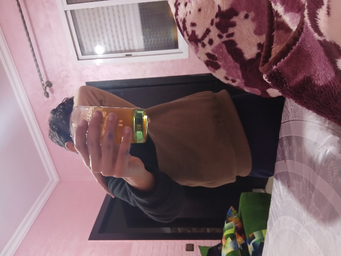 A person with dark hair is holding a glass of orange liquid. They are wearing a brown sweater and a black long-sleeved shirt. Behind them is a dark door and a window with closed blinds. The room has pink walls and a white ceiling with molding. Part of a patterned, possibly fur, blanket is visible in the top right corner. There are items on a table in the foreground.