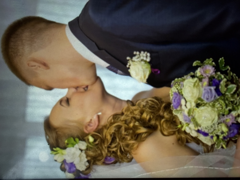 A forensic examination of the image reveals two individuals, a male and a female, engaged in a kiss. This event is situated in Dmitrov, Russia. The female, identified as a bride, presents with styled, curly brown hair adorned with white, purple, and green floral arrangements, a visible sheer white veil, and a small, light-colored teardrop earring. She is wearing a white strapless garment and holds a multi-toned bridal bouquet composed of white, purple, and green flowers. The male, identified as a groom, has short, light brown hair with a faded cut. He is attired in a dark navy suit jacket, a white dress shirt, and a patterned dark tie. A white rose boutonnière with small white filler flowers and a purple ribbon is pinned to his left lapel. Both subjects are oriented in profile, with their mouths pressed together. The immediate background is an unfocused, light-toned area, consistent with an indoor setting.