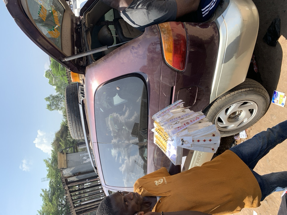 The image depicts an outdoor scene in Onitsha, Nigeria, under a bright, clear sky with visible clouds