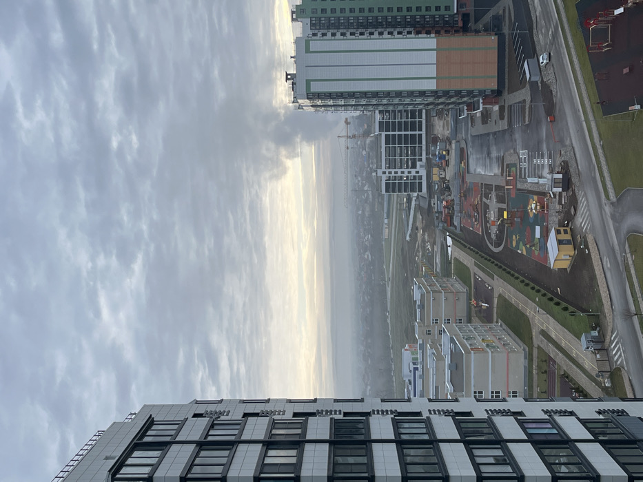 From a high angle, buildings dominate a cityscape under a cloudy sky. Modern architecture is visible, including new constructions with playgrounds and roads. The horizon suggests an urban sprawl, with distant buildings obscured by haze. A construction crane stands near a building. The photo appears to be taken from a high-rise apartment or office building.