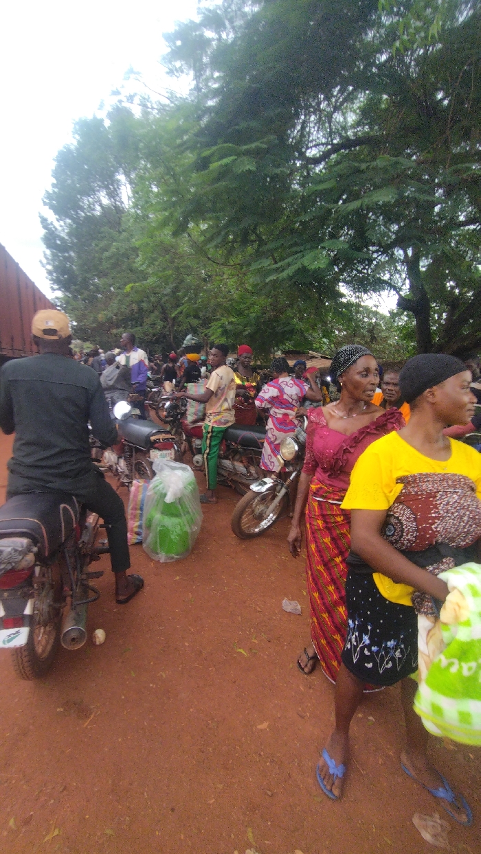 This image depicts a bustling outdoor scene in Ito, Nigeria, characterized by a gathering of people and motorcycles on a reddish-brown dirt ground