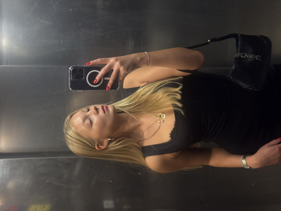 A young woman with blonde hair is taking a selfie in what appears to be an elevator. She's wearing a black dress and has a black handbag on her shoulder. She is also wearing a gold necklace, hoop earrings, and a bracelet. Her nails are painted red, and she's holding a phone with a clear case. The elevator has a textured metal surface.
