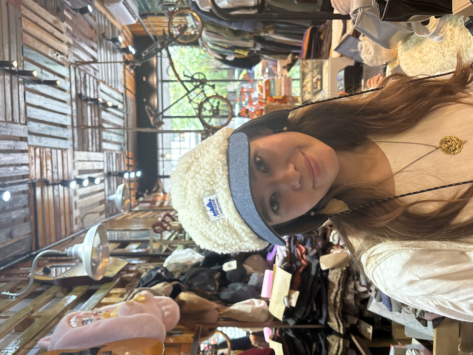 A young woman with long brown hair wears a white, fuzzy baseball cap with a blue brim and a gold pendant necklace. She is smiling slightly. The background features a quirky shop interior with clothing racks, vintage items, and a bicycle hanging from the ceiling. One wall is constructed from light-colored, uneven wooden planks and decorated with lights. The photo appears to have been taken with a slightly rotating angle.