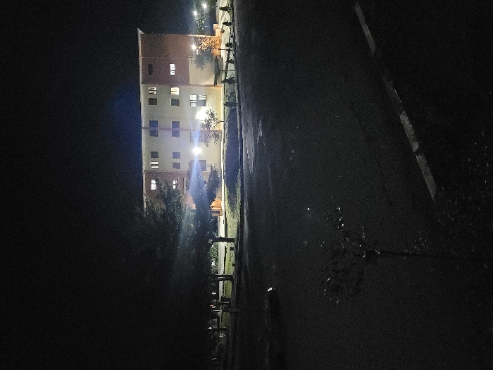The image depicts a nighttime scene in Gaba, Nigeria, focusing on a four-story building. The building, constructed with a light-colored facade and reddish-brown vertical accents, is illuminated by numerous interior window lights and exterior ground-level fixtures. Several trees with dark foliage are positioned in the midground, between the building and the foreground. The foreground features a dark asphalt surface, possibly a road or parking lot, which exhibits reflective patches consistent with wetness. A concrete curb is visible along the lower right edge of the frame. No individuals, animals, or vehicles are present. The ambient lighting is exclusively artificial, originating from the building and other distant light sources, against a dark sky.