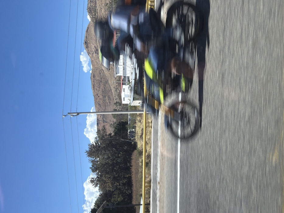 A blurred image shows two motorcyclists riding on an asphalt road with white and yellow lane markings. A backdrop of mountains, utility poles, and blue sky with puffy clouds creates the scene's landscape. Trees and shrubs border the side of the road. The camera's motion contributes to the indistinctness of the speeding motorcycle figures.