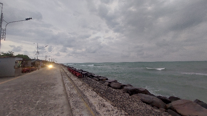 The image displays a coastal scene in Lhokseumawe, Indonesia, under an overcast sky. A concrete road occupies the left portion of the foreground and extends into the distance. Along the immediate left edge of the road, several small, simple vendor stalls with awnings are visible, fronted by multiple red plastic chairs and small tables arranged for seating. Behind these stalls, green foliage is present. A series of streetlights or utility poles line the road on the left, receding into the distance. In the mid-ground, a vehicle approaches on the road, its headlights brightly illuminated and generating significant glare. To the right of the road, a concrete barrier separates it from a rocky breakwater constructed from large, irregular grey boulders. A row of red chairs and small black tables is positioned along this concrete barrier, facing the water. Beyond the breakwater, the greenish-blue sea features visible waves breaking against the shore and extending towards the horizon. No individuals are present in the scene.