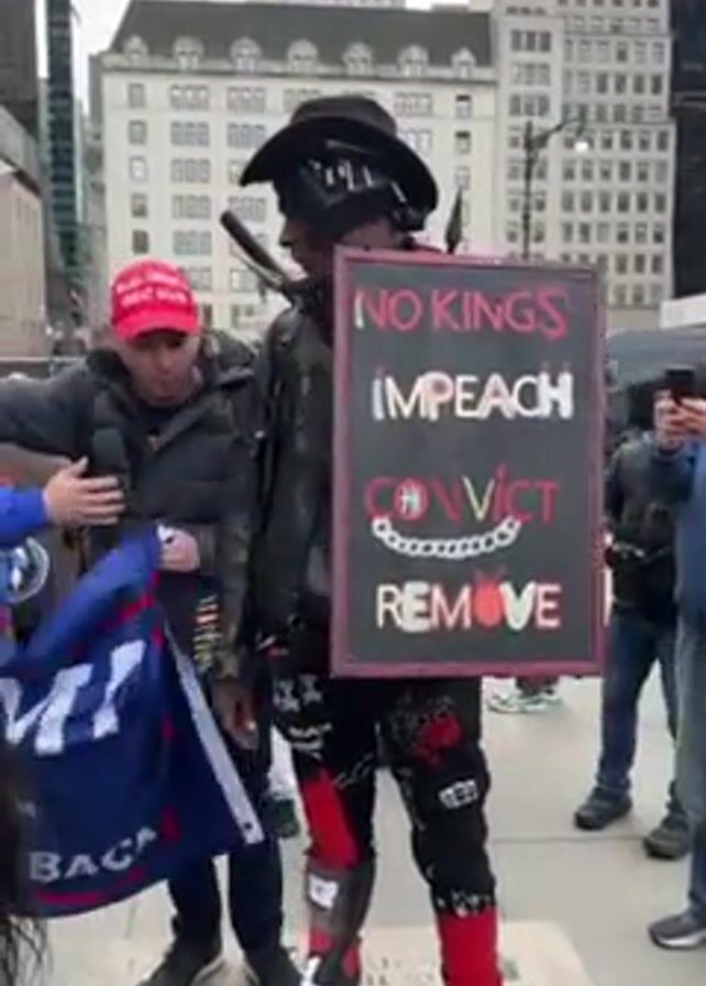 n outdoor political confrontation in a city. A person wearing a black cowboy hat and facemask holds a sign that says "NO KINGS, IMPEACH, CONVICT, REMOVE." A person holding a "Trump 2024" flag engages with the sign holder, and an altercation ensues where the person with the flag appears to be pushing at the sign. Other people are present, observing and filming with their phones. Buildings form the backdrop to the scene.