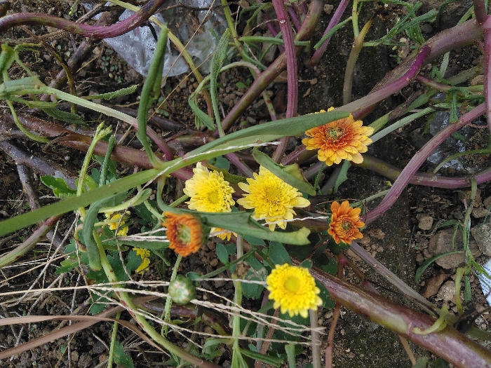 The image presents a ground-level, close-up view of mixed vegetation in the city of Nathene, Laos. The central focus includes multiple small, composite flowers exhibiting vibrant yellow and reddish-orange hues, with some in full bloom and others appearing as buds. Specifically, five distinct yellow flowers and three reddish-orange flowers are visible, along with one green flower bud. These flowers are intermingled with various plant stems; prominent features include slender green stems with associated foliage and several thicker, smooth, reddish-purple stems emerging from the ground. The soil base is dark brown, uneven, and contains scattered small stones and organic debris. Dried, light-colored grass blades are present in the upper left quadrant. A piece of translucent, white plastic-like material is partially visible embedded within the vegetation and soil in the mid-right portion of the frame. No individuals, animals, or significant man-made structures are depicted.
